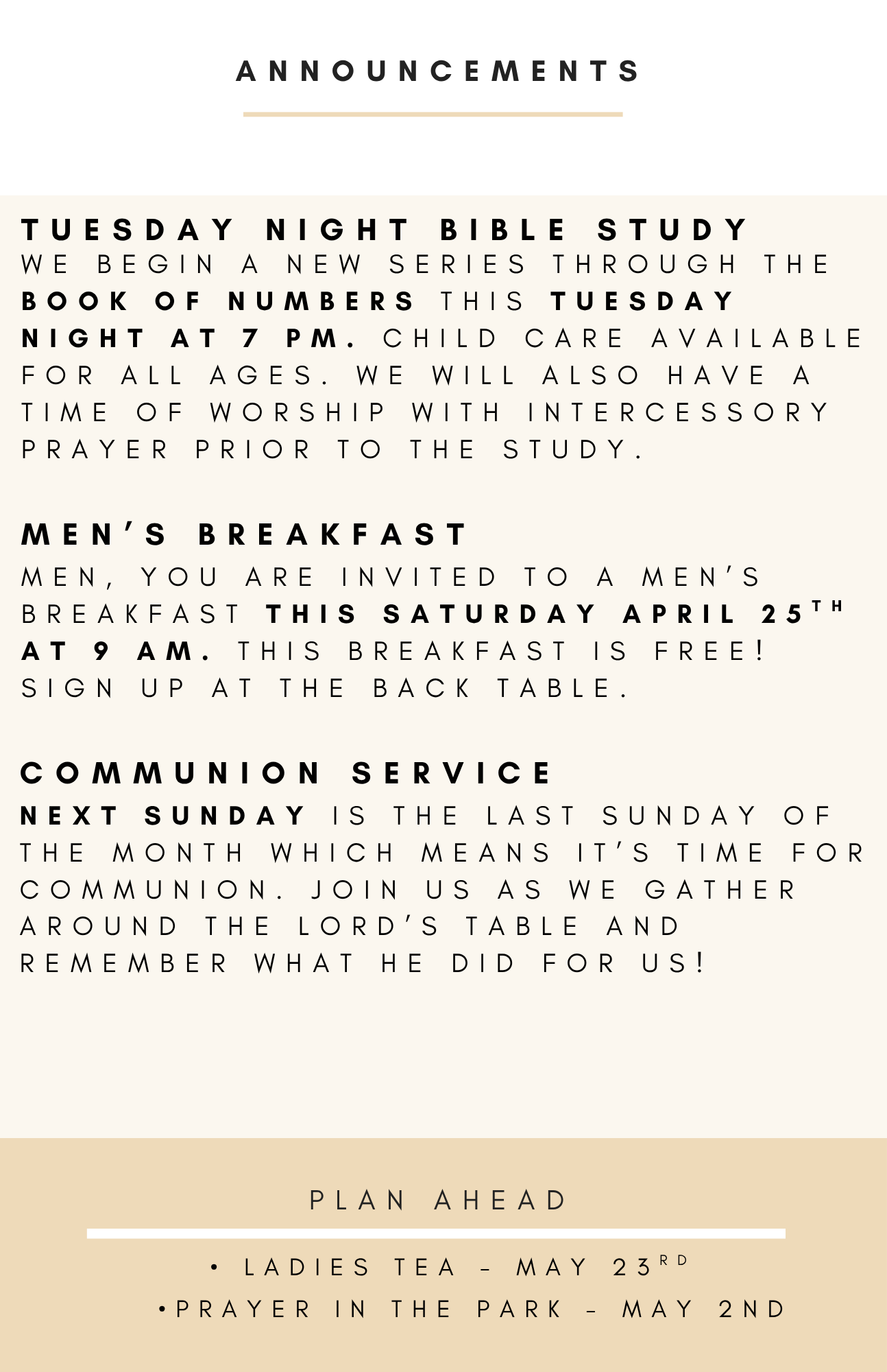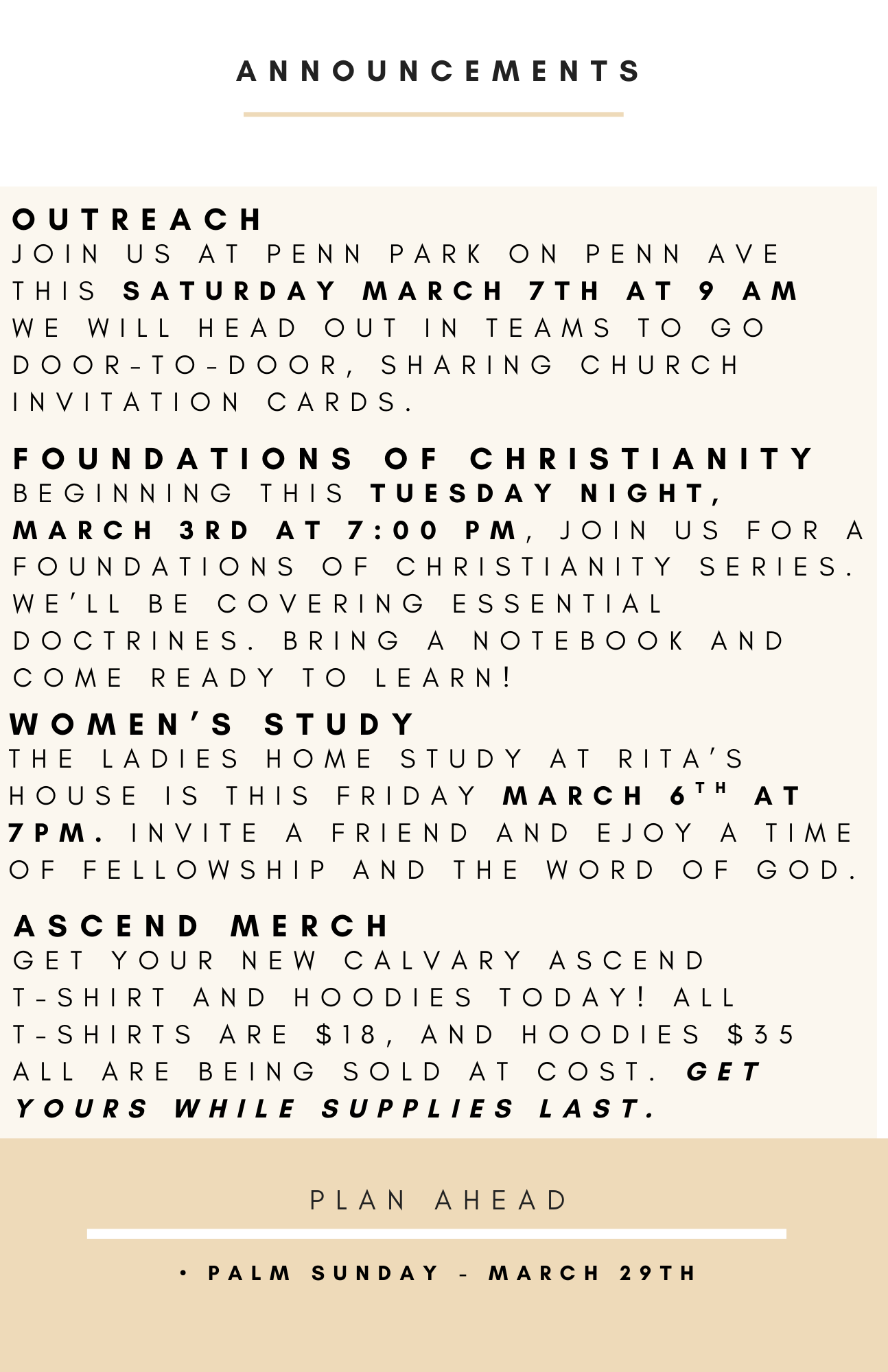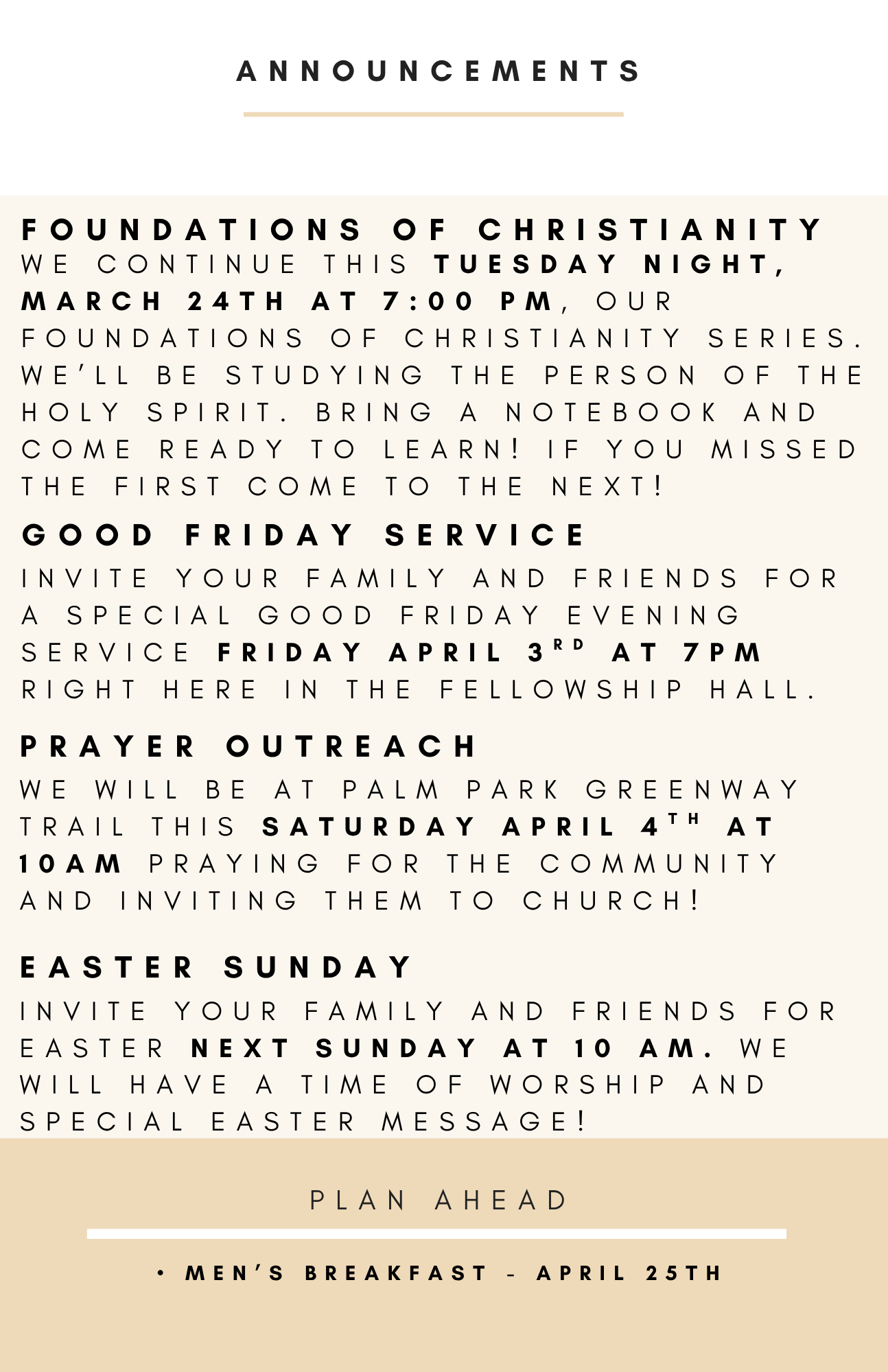 Sunday morning worship begins at 10 am. We teach the Bible book by book, chapter by chapter, and verse by verse.