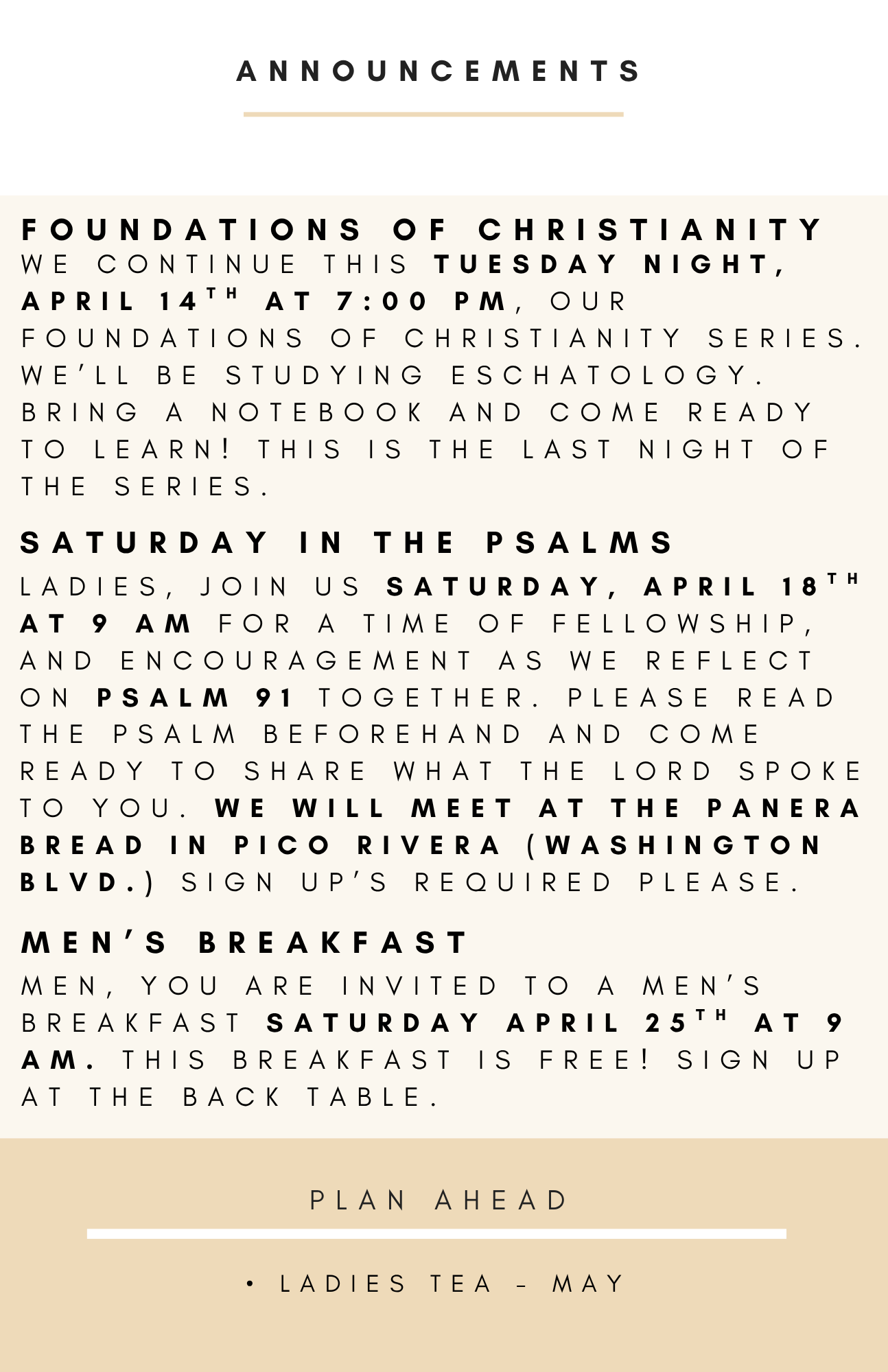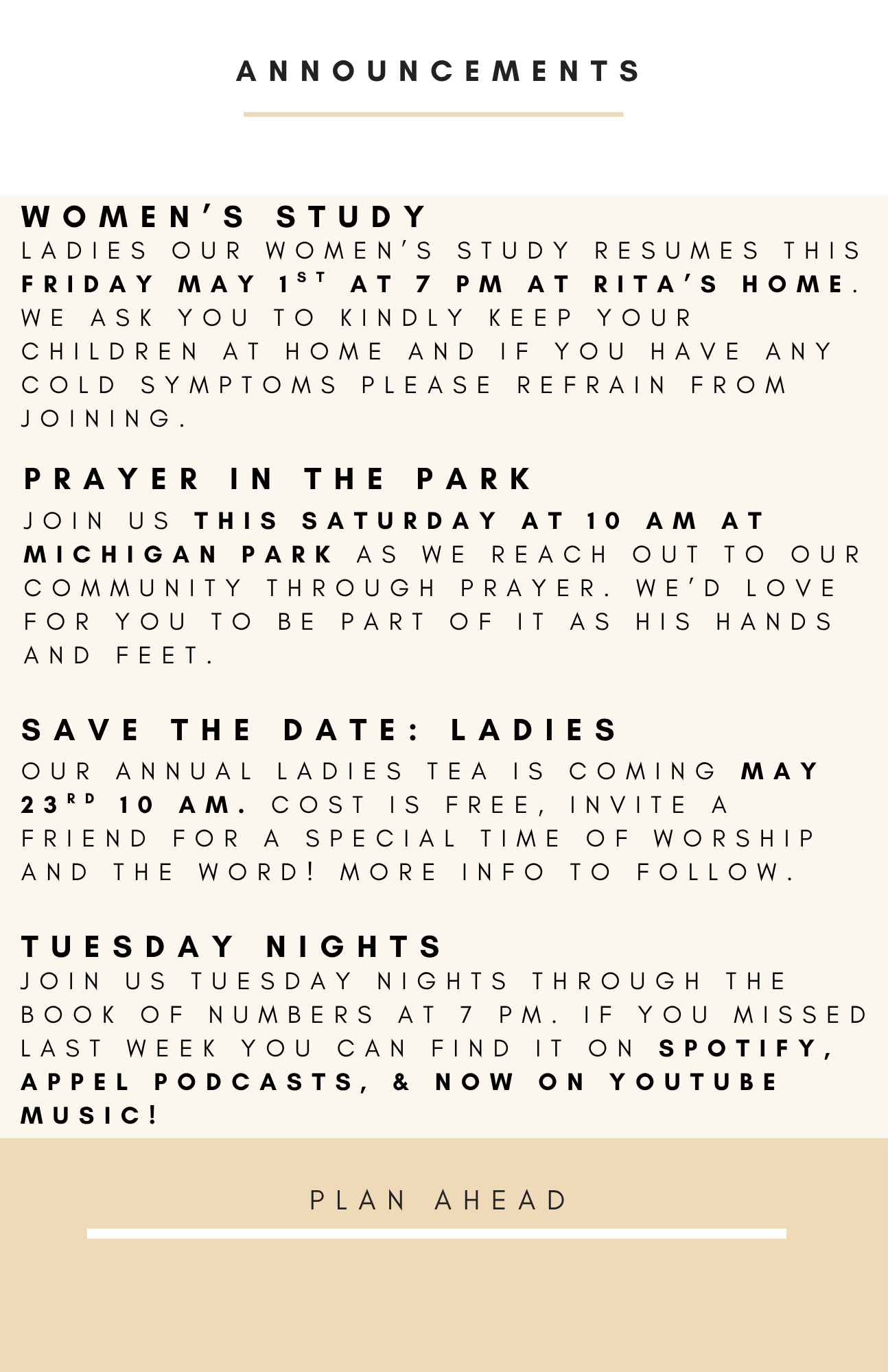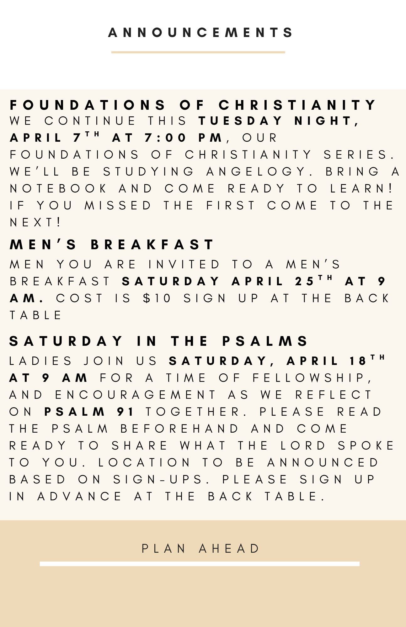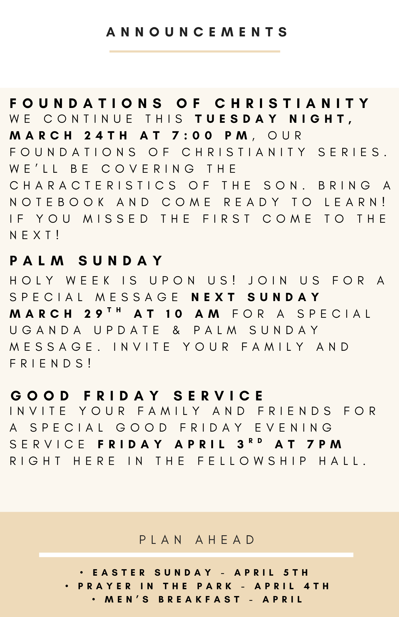 Sunday morning worship begins at 10 am. We teach the Bible book by book, chapter by chapter, and verse by verse.