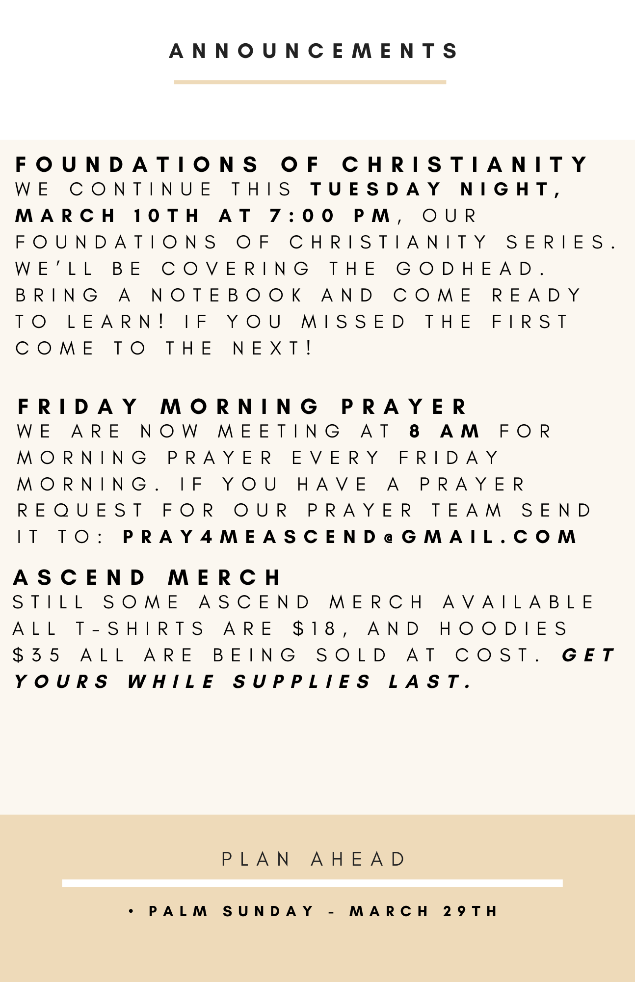 You are welcome to worship with us. Let us know if you are coming and how you would like to get involved with Ascend!